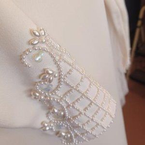This designer wedding gown is an original Priscilla of Boston, Beautifully Sewn with pearls around the neck, sleeve, an hem.