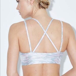 PrismSport Pink/Gray Shiny Camouflage Padded Sports Bra. NWT. Shiny camouflage print sports bra in pink and grey. Removable pads. Quick drying. Machine washable. Made of polyester, spandex and nylon. Size L.