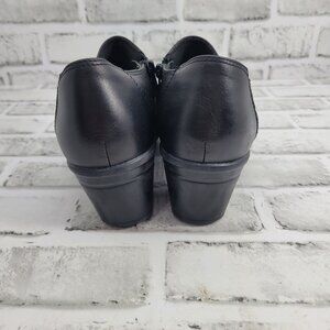 Pristine, like new condition. Black leather Emslie Warren booties by Clarks. Inside zipper, loop and button on outside. Women's size 8