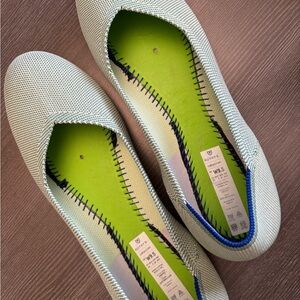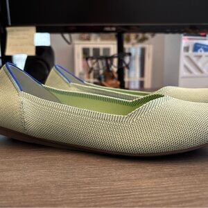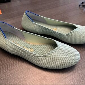 Experience the perfect blend of comfort and style with Rothy's green flats. Crafted from a textured, woven fabric, these shoes feature a minimalist design with a rounded toe and a clean silhouette. Ideal for everyday wear, they offer a sophisticated yet casual look.