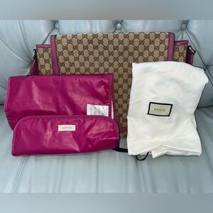 Original Gucci Diaper Bag crafted in Original GG Canvas with contrasting purple leather trim and accented with silver-tone metal hardware. This bag has a snap feature on the canvas strap that allows attachment to a stroller for convenience. Includes a changing pad to ensure safe and secure cleanup for all of life's little mishaps.