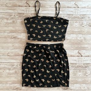 Privé Gold Butterfly Print Black Crop Cami Top & Split Hem Bodycon Skirt Set LP