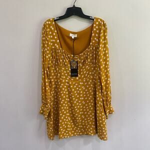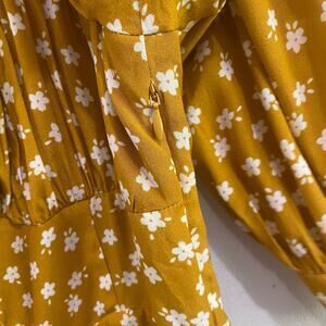 Privacy Please Giustina Mini Dress in Gold Rebecca Floral Size Large. Dry clean only Fully lined Lightweight crepe fabric with ruched detail Front button placket and buttoned cuffs Hidden side zipper closure Imported Revolve Style No. PRIP-WD861 Manufacturer Style No. PPD648 F19