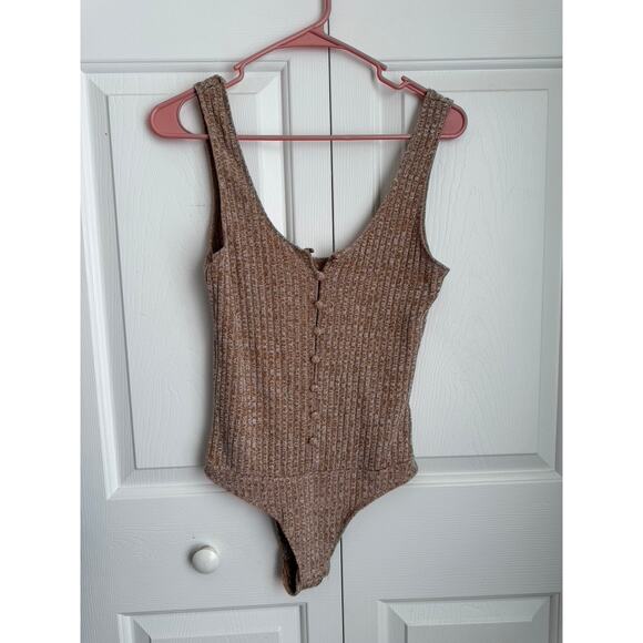 This is a Privacy Please button-front sweater woven bodysuit from Revolve. It is in excellent condition and has been well-cared for. The size is Small.