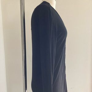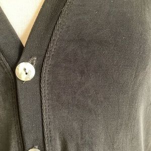 Private Edition by Chico’s Black Cardigan with pearlescent front buttons. Size: 0 (fits like a medium/ large). 94% Acetate & 6% Lycra. Made in USA.