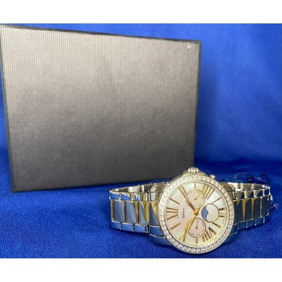This auction is for a gorgeous woman’s private label watch. This is two tone, features a 39MM case, mother of pearl dial, moon-phase, gold tone markers/hands, sapphire crystal, water resistant 5ATM, deployment buckle, crystal bezel. This also comes in the original box. Stunning watch.