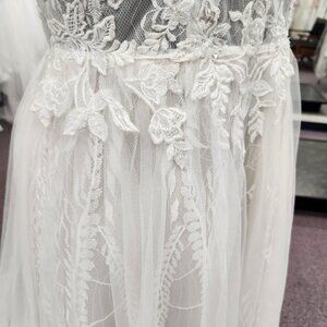 Halter V-neckline, Boho-floral appliques on top of sheet lace and tulle, A-line skirt chapel train.