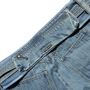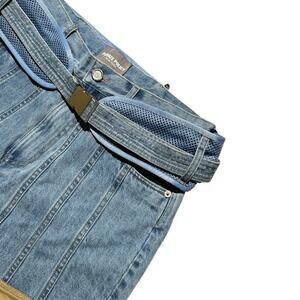 Retail $475. Unique pants with two materials combined. Features a wide leg fit and a removable buckle waist bag.