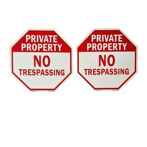 New! Two Private Property No Trespassing Octagon Signs! Weather Resistant! Commercial Grade Aluminum! Comes with a 2-piece aluminum mounting stake, 3 nuts, 3 screws, & a wrench for quick assembly.