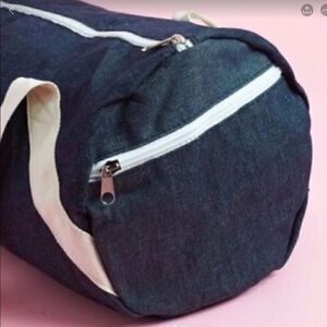 Denim gym bag with cotton handles, outside zipper pocket & inside open pocket. Perfect for the gym, yoga, barre, spin, or everyday use.