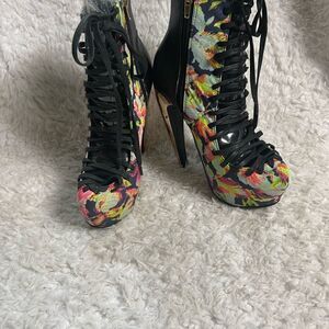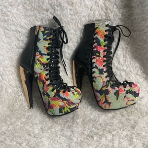 Privilege Stayhigh Floral multi color lace up hidden platform ankle boots size6 gold tone cover heels.side zipper.Pre owned in good used condition small peelings on the inner lining.see all pictures any questions please message.