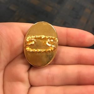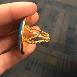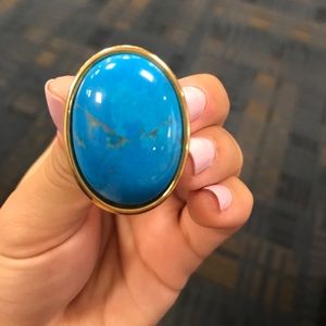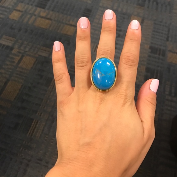 This Privileged Turquoise Oval Ring Is one size fits all. This ring can be adjusted to any size that fits your finger. It is 14K yellow gold-plated brass ring with Turquoise dyed howlite oval stone. It is 1 1/4 inches long and open ring band to fit all fingers. This ring is i. Great condition!