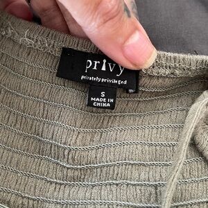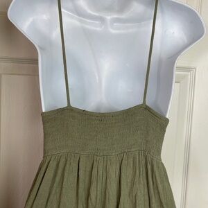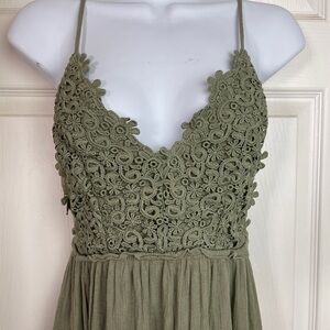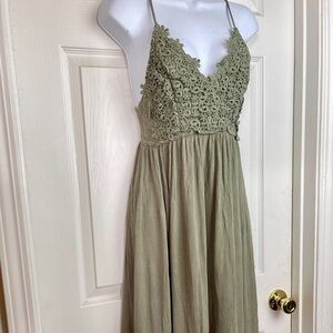This pretty, olive-green color, mixed media maxi dress features a draped, crepe bottom paired with a beautifully crocheted bust. The back is smocked to allow for comfortable Sweet with a touch of sexy. Spaghetti straps and very lightweight. A flirty and flowy dress perfect for spring and summer. Sz.S Approximate Measurements: