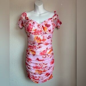 Privy Pink Floral Ruched Corset Mesh Overlay Bodycon Mini Dress L
