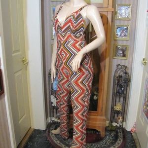 Fabulous jumpsuit by Privy in size L. Colors are red, yellow, black & blue. 96% polyester 4% spandex. Hand wash. Measurements....34" in bust area but will stretch to 38".....29" in midsection.....36" in hip....about 60" in length with inseam of 35"....22" around leg seam. Excellent condition.