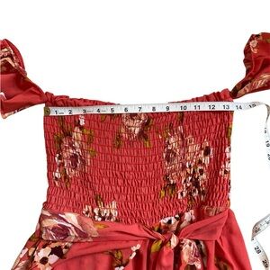 Preowned Privy Rose Floral Smocked Bodice High-Low Wrap Style Romantic Flowy Summer Sundress. No Size Tag, but Estimated to fit a Size Medium. Smocked stretch bodice. Faux wrap style, with belted front tie. Flutter cap sleeves that can be worn on or off-the-shoulder.