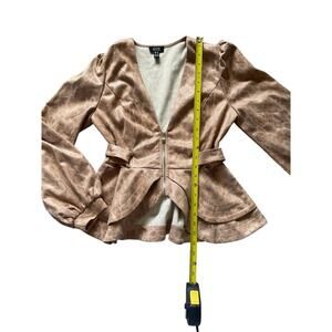 Privy Ruffled Peplum Shaket Faux Pink Suede Snakeskin, Deep V Neck with Zipper and Front Tie and Puff Sleeve