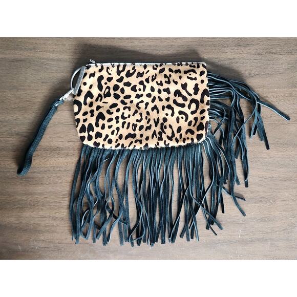 Prüne Leopard Print Haircalf Look Leather Suede Fringe Wristlet Bag Western Boho