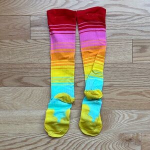 Vibrant knee-high socks with a gradient design. Features red, orange, yellow, and blue hues. Perfect for adding a pop of color to any outfit.