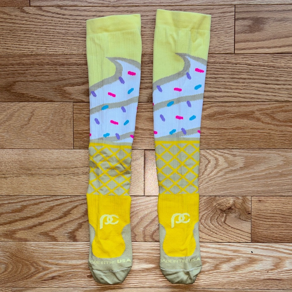 Vibrant knee-high socks with a playful pattern. Features yellow, white, and multicolor accents.
