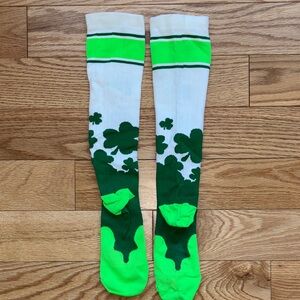 Celebrate in style with these vibrant green and white knee-high socks featuring a fun shamrock design. Perfect for adding a festive touch to any outfit.