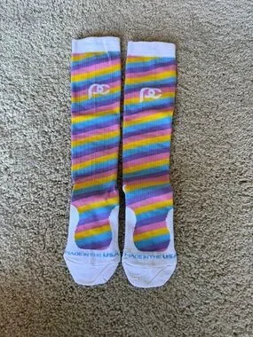Unisex over the calf compression socks with bold horizontal pastel stripes. Soft knit fabric for everyday wear. Icon logo on the calf for branded detail.