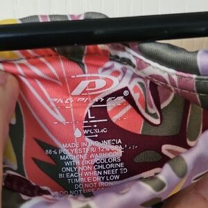 Stylish leggings with a multicolor leaf design. Features pink, yellow, and purple hues.