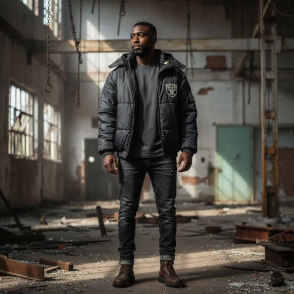Vintage Pro Player Oakland Raiders reversible puffer jacket, estimated men’s XL (no size tag – see photos for flat measurements). Heavy and warm with classic black and silver team colors and bold Raiders logos on both sides.