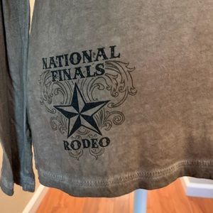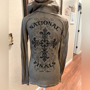 Never worn. Pro Rodeo top. Nationals Las Vegas. Size Medium but fits like a Small. Has hoodie, long sleeves, taupe with black accents. Smoke free