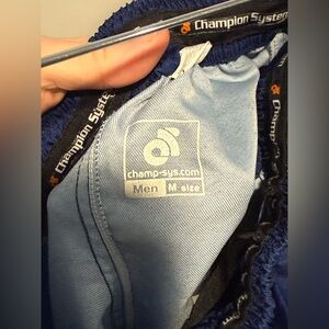 Champion athletic shorts with navy and red design. Ideal for sports and casual wear.
