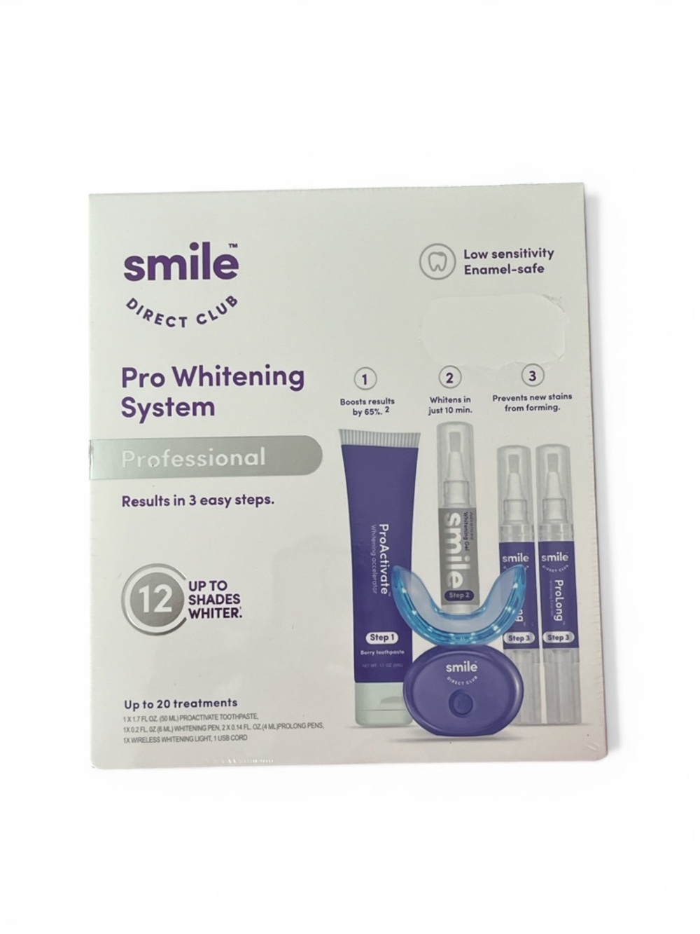 Pro Whitening System in purple. Professional whitening kit with low-sensitivity, enamel-safe formula. Boosts results, whitens in minutes, and helps prevent new stains. Includes whitening gel, pens, and mouthpiece for up to 20 treatments.