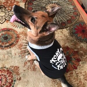 Silly tee for your pup! Notice the model showing it off in the pics - fits a full grown german shepherd. i will throw it in the wash before shipping!