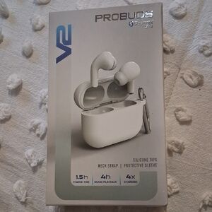 earbuds, new, not used, neck strap, protective sleeve, silicone tips, charge time 1.5 h