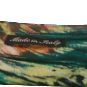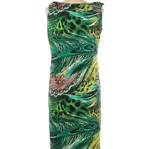 tropical dress • made in Italy • sleeveless • feather print • summer fashion • cruise wear • resort style • vibrant colors • peacock pattern • size large