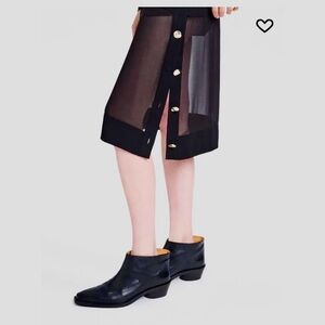 Elegant black pencil skirt with sheer panel. Modern and sophisticated design. Zipper and button at waist with side buttons.