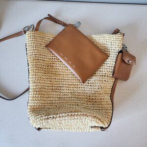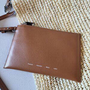 "EUC" Fantastic Straw/Raffia Bucket Bag By Proenza Schouler White Label. Yellow Raffia/Natural with Color Variations, Brown Leather Trim & Accessories, Single Top Handle 19" Drop that Can Loop Through for Sling Style or Shoulder, Magnetic Snap Closure, Leather Interior Bottom for Stability, Removable Exterior Small Leather Pouch & Removable Interior Large Leather Zip Wallet/ Pouch ( never used), Large Pouch Measures approx 5.5" T X 8" W, Bag Measures approx. 13" T X 14.5" W at Top X 5" Oval Deep, Great Used Condition, No Stains, No Wearing on Leather, Minor Shedding/Rubbing on Straw Natural for This Material :) Rt.495.00 approx. * Perfect Pack-able Vacation Bag!