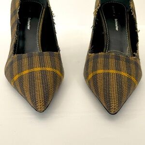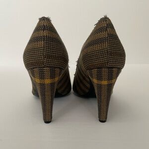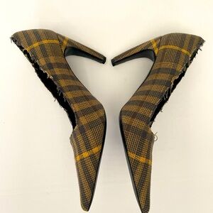 Crafted in a heritage brown and yellow plaid, the Plaid Curved Heel Pumps feature a skinny curved heel, pointed toe, and squared-off vamp. Frayed edge detailing throuhgout. Made in Italy.