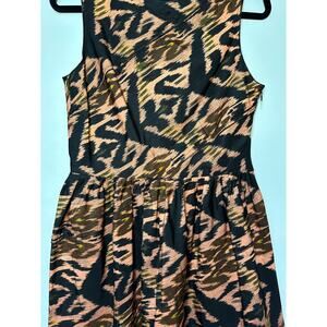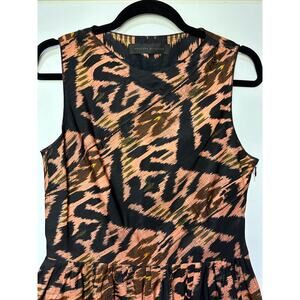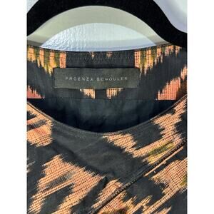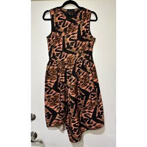 Stylish high low dress by Proenza Schouler. Features bold orange and black pattern. Sleeveless design with a unique hemline.
