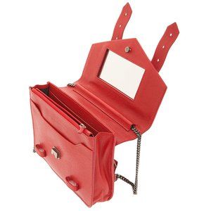 Red leather Proenza Schouler PS1 Large Wallet Chain with gunmetal hardware, chain-link shoulder strap, exterior zip pocket at back, mirror and slit pocket at flap underside, grey and black jacquard lining, six card slots, three pockets at interior walls; one with zip closure and slide-lock and fold-in flap closures at front.