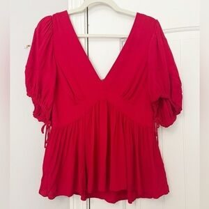 Red crepe (100% Viscose). Top. Short puff sleeves. Deep v-neckline. 24" from shoulder to hemline.