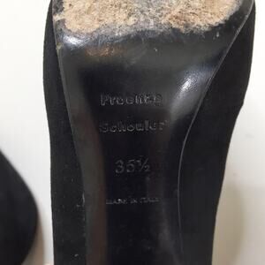 Black suede Proenza Schouler ankle booties with pointed-toe, tonal stitching, covered heels and zip closure at uppers. Includes dust bag. Heel 4.25".