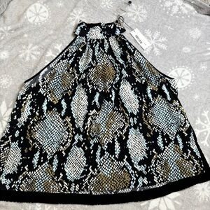 The Printed Snake Crepe De Chine Top is cut to a fluid silhouette with softly gathered pleats. Defined by an all-over animal print, it's framed with a high button-fastening halter neck.