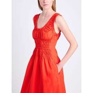 The Penny Dress in Poplin is cut to an hourglass silhouette that softly cinches in with a ruched waist. Finished with a scoop neck, upper bodice ruched detailing and hidden front slip pockets.