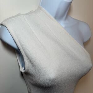 Stunning designer gown from Proenza Schouler. Ivory white one-shoulder design with textured crepe bodice and pleated sheer hem. Fitted silhouette with elegant structure and subtle shoulder detail.