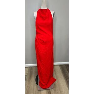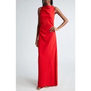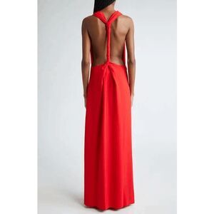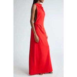 This Proenza Schouler gown is masterfully draped with an open back and a twisted strap. It features a hidden side-zip closure, cowl neck, sleeveless design, and cutaway shoulders. The gown is composed of 70% triacetate and 30% polyester.