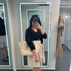 Cream leather, black rolled leather shoulder straps, magnetic closure, unlined