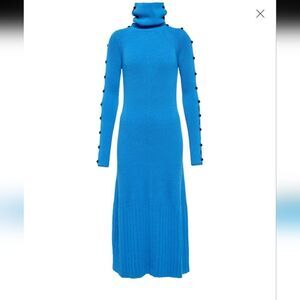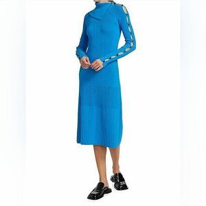 This sweater dress from Proenza Schouler is knitted from cotton-blend yarn using ribbed stitches. Accented with buttoned seams, it has raglan sleeves, a turtleneck collar, and a midi length.
