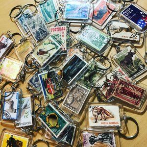 This unique keychain is handmade in Virginia, USA. We use real postage stamps that have traveled around the world and can travel again with you!