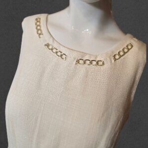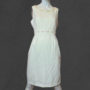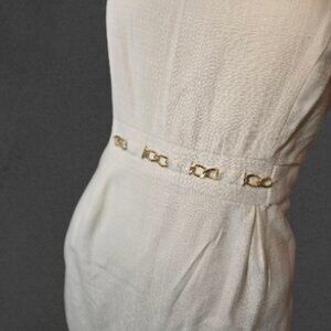 NWT White "Linen" dress by LIZ CLAIBORNE. Gold chain detailing at neck and waist. Fully lined. Poly/Rayon blend.