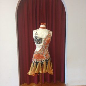 This beautifully designed latin ballroom dress, black and orange colors, decorated with rhinestones. Comes with matching choker and braclets. Size Sm/Md. Length between 5' 2" to 5' 5".